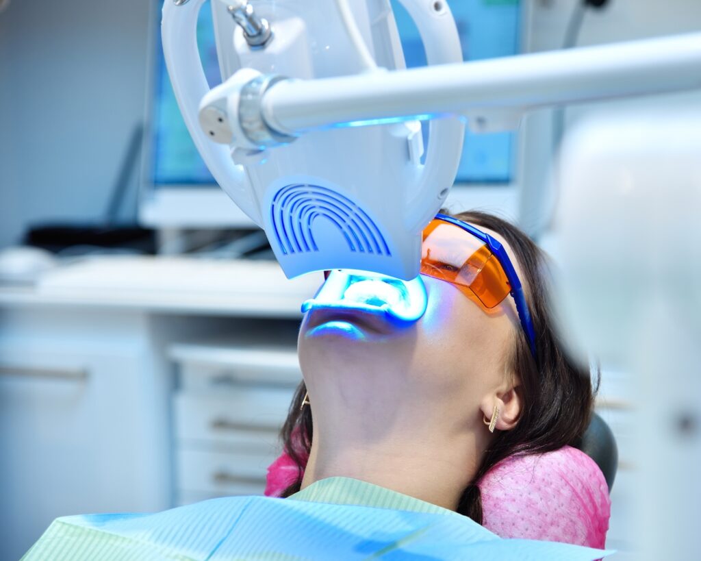 Professional bleaching often involves laser treatments or power bleaching techniques. During laser whitening, a laser activates the bleaching gel to accelerate results. Dentists apply a protective gel to shield soft tissues and minimize gum irritation before starting the procedure.